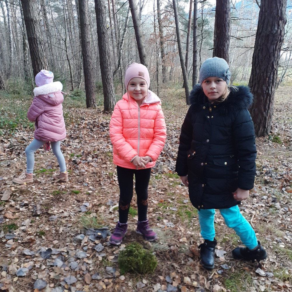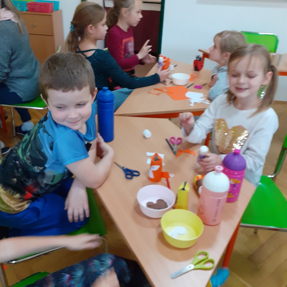 Zvířátka v lese, takové bylo téma tohoto týdne. Ve školní družině jsme si s dětmi vyrobili vlastní lesíček. V pozadí se tyčí vzrostlé borovice, mezi nimi se ukrývá liščí rodinka. Na okraji lesa hopsají zajíčci ušáčci a hledají něco k snědku. V měkkém mechu se povalují ořechy, kaštany, šípky, bobule, bukvice a šišky.  Sovičky se rozhlížejí z nízké větve. Berušky letící kolem pozorují krásu podzimního lesa.