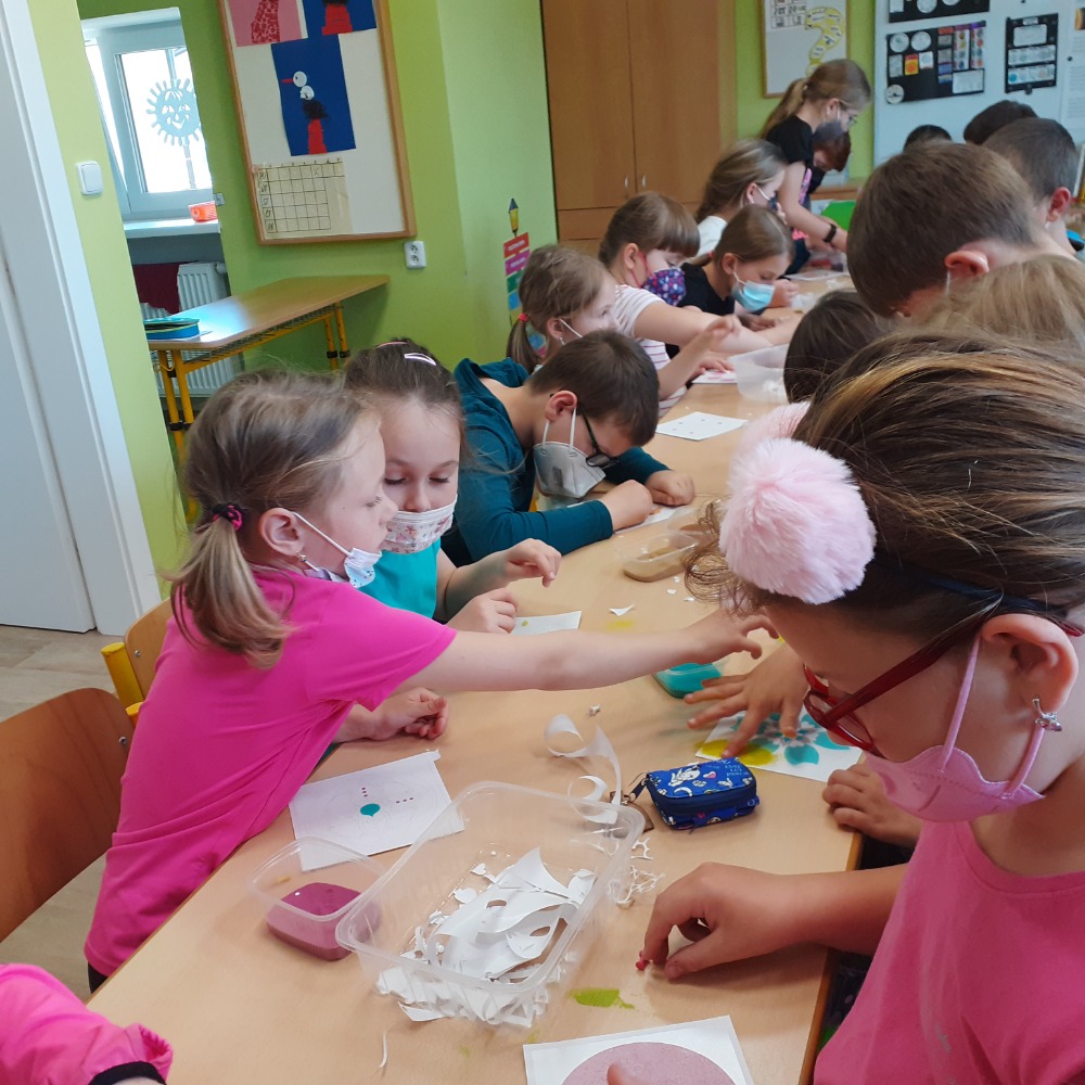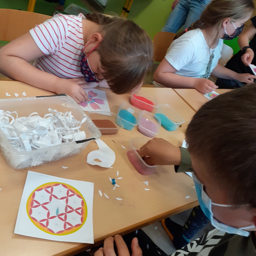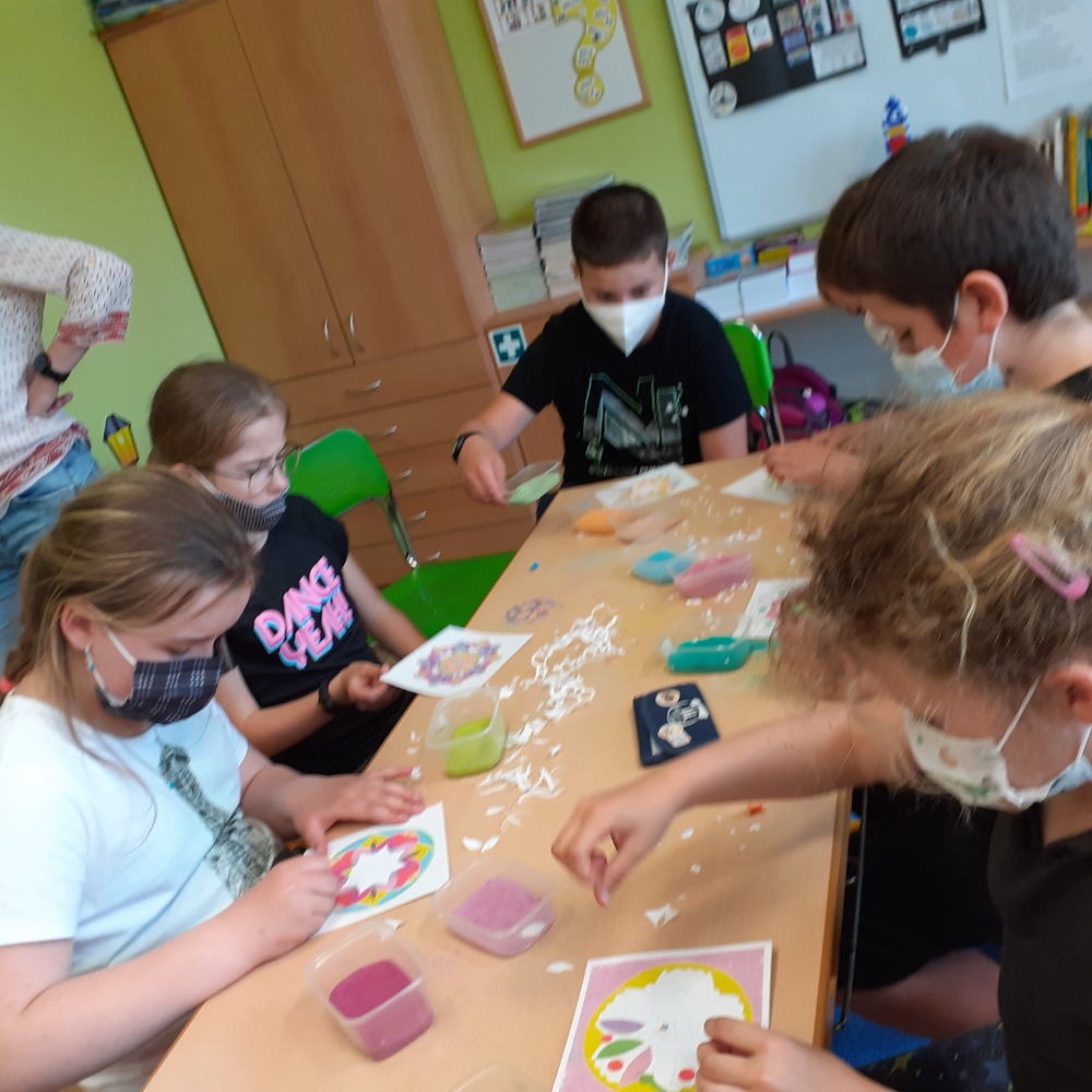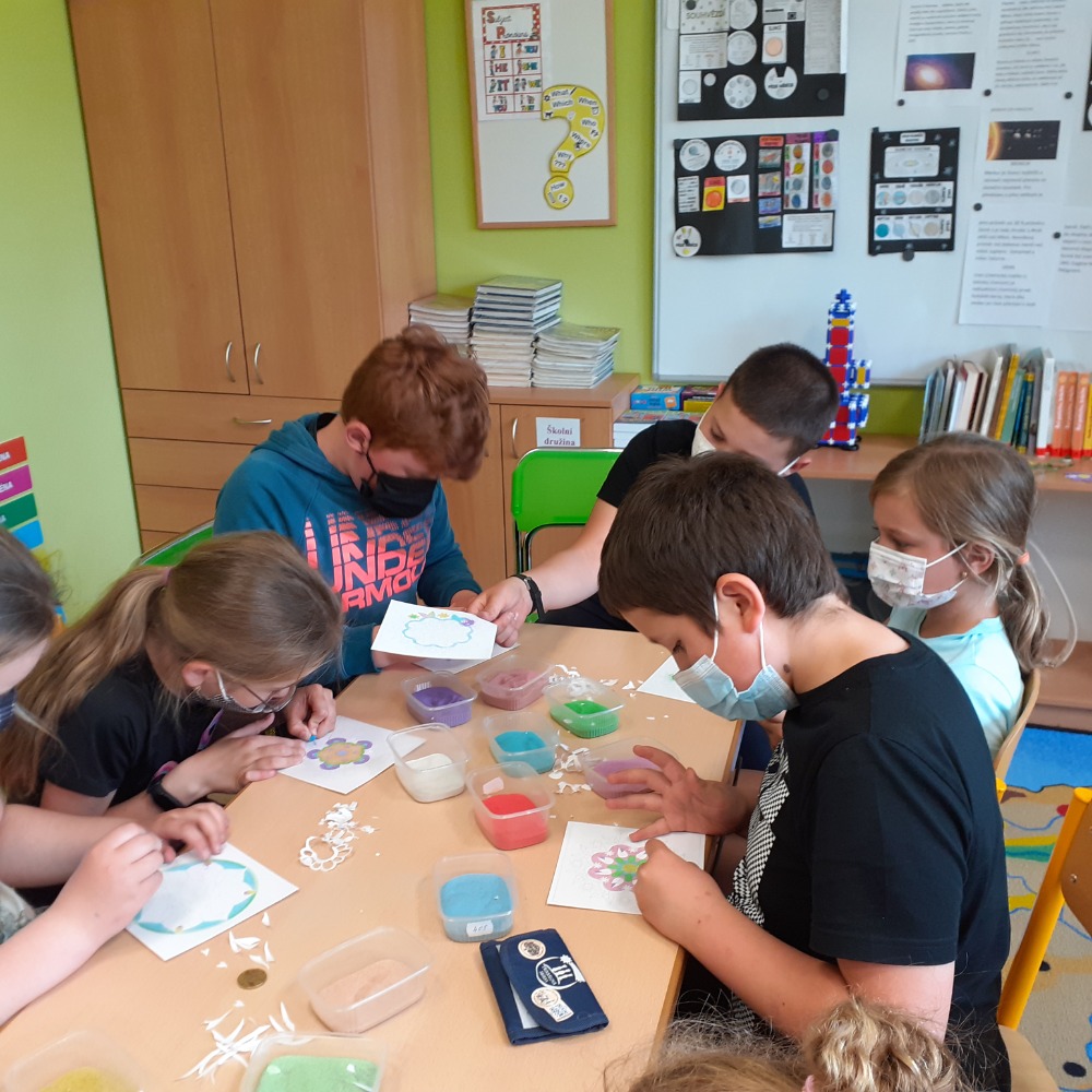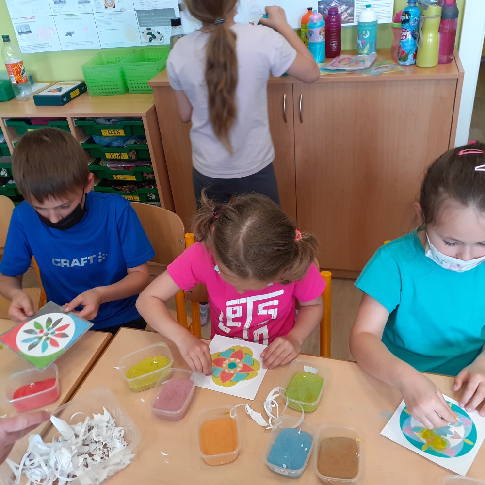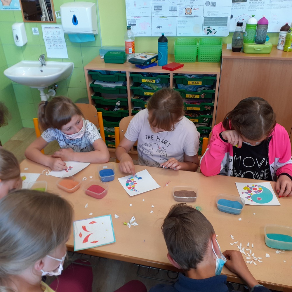 Pískohraní se zúčastnili se žáci 1.- 5.tříd. Děti si vyzkoušely techniku malování barevným pískem a procvičily si hrubou i jemnou motoriku. Motivem obrázků byly mandaly, děti tak mohly rozvíjet svou fantazii a kreativitu. Všem se obrázky opravdu povedly. Děti tato akce moc bavila. Děkujeme paní lektorce za zajímavou tvořivou dílnu a těšíme se na další spolupráci.