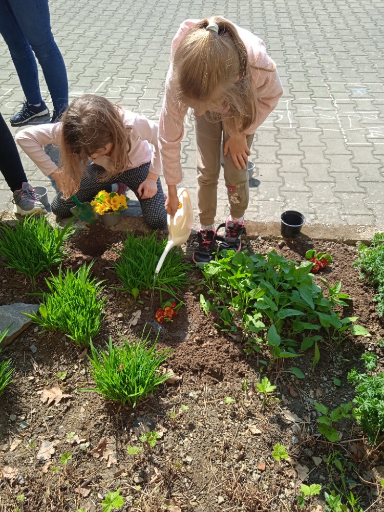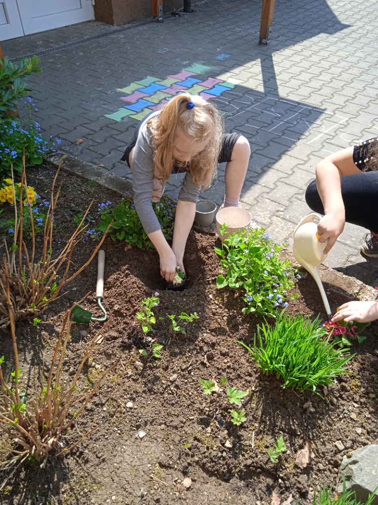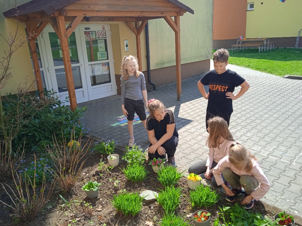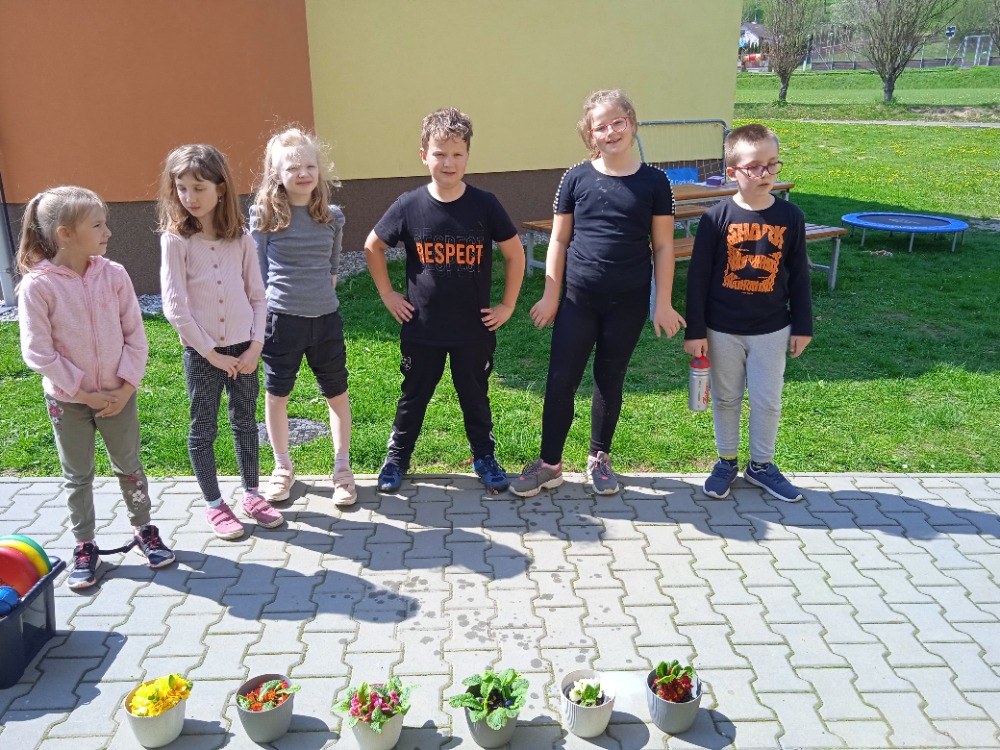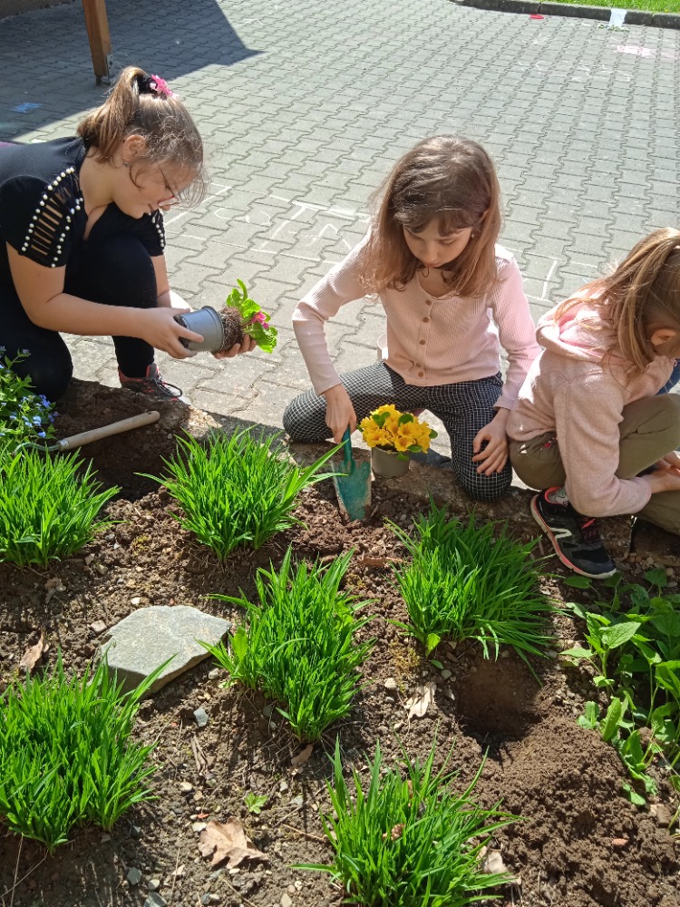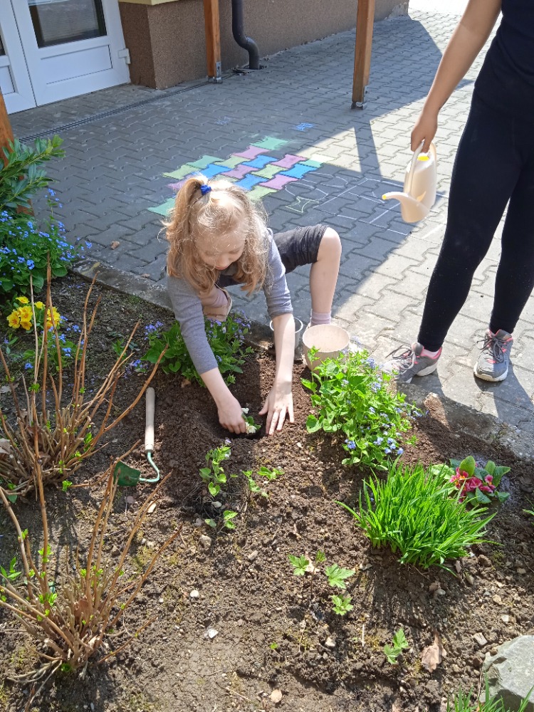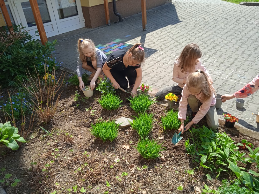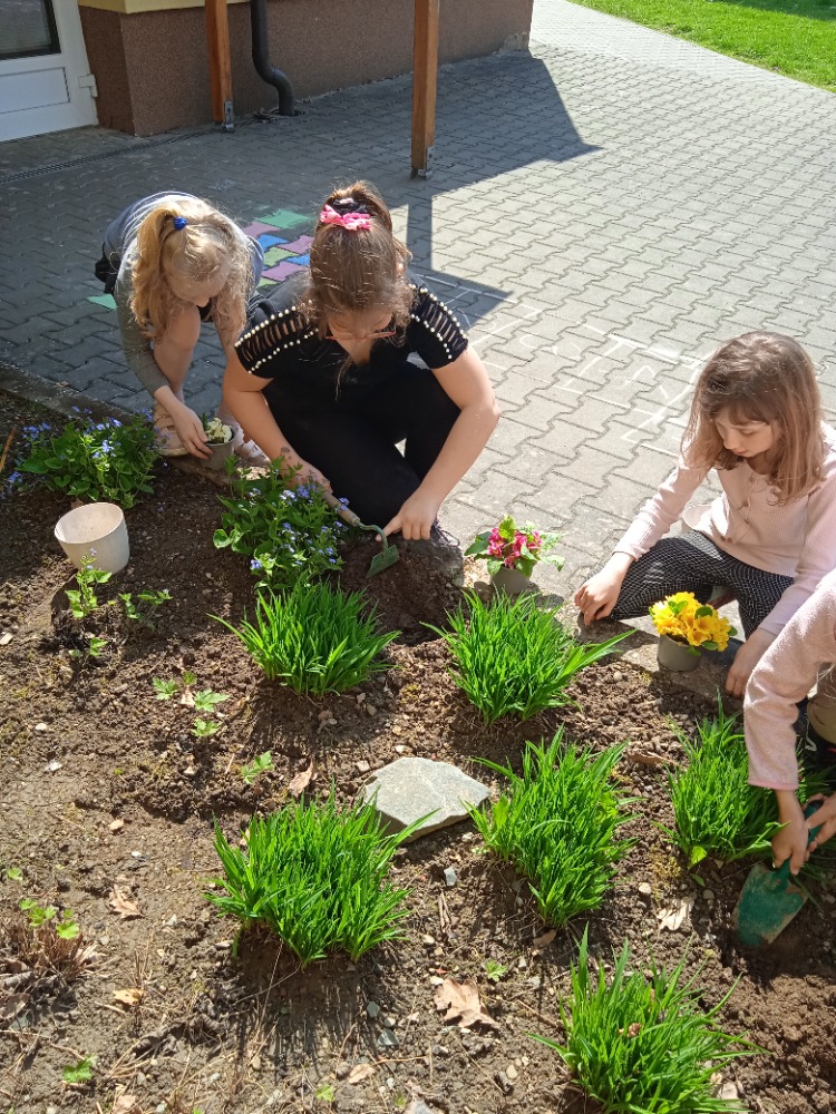 Jarní sluníčko nás vítalo v novém školním týdnu. Hezkého počasí využily děti z II. oddělení ŠD k jarnímu zahradničení. Do záhonu před budovou školy si vysadily barevné primule, aby nám hezké dny připomínaly co nejdéle.