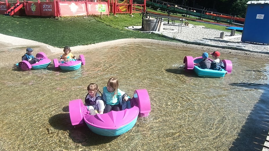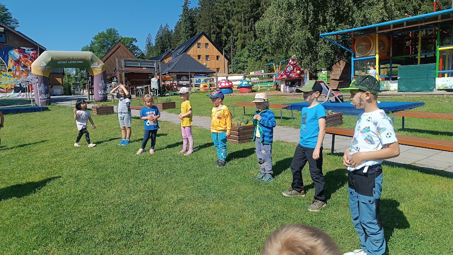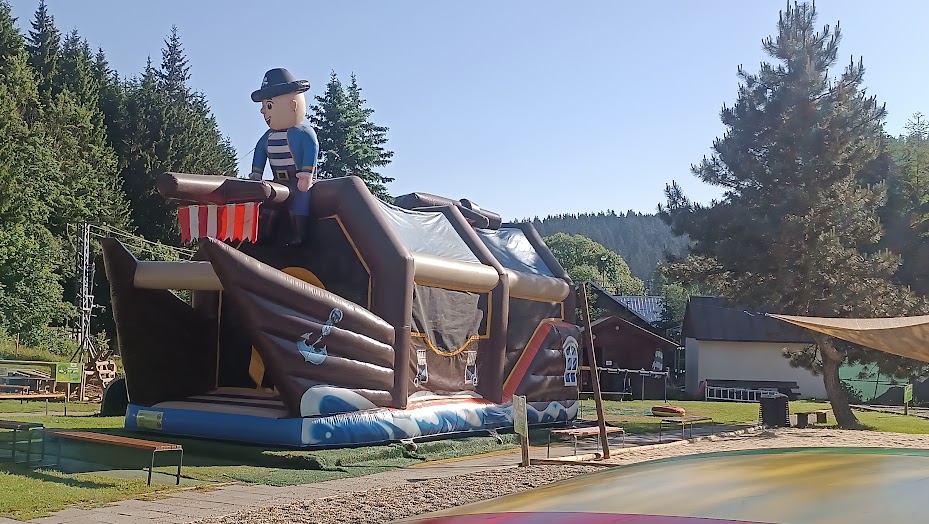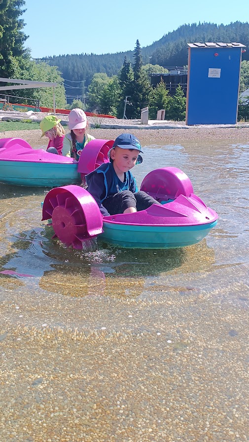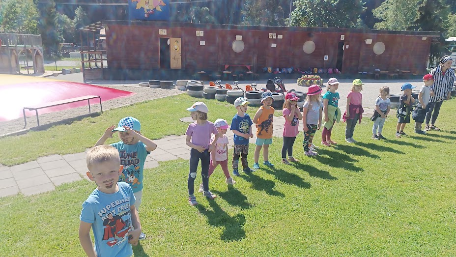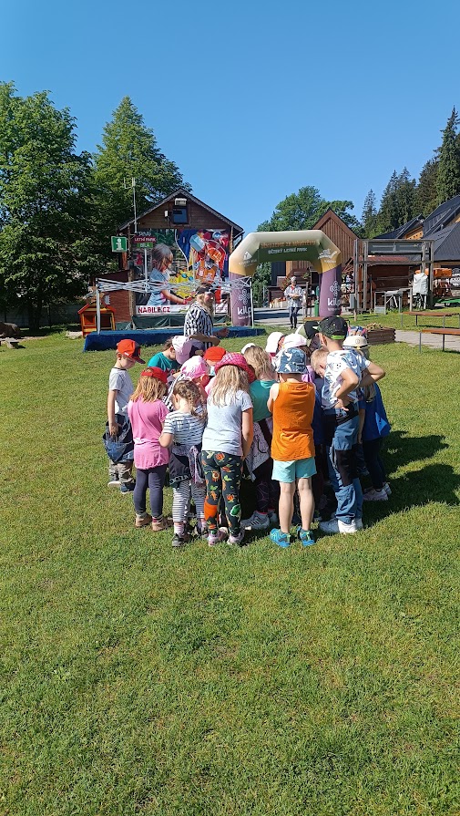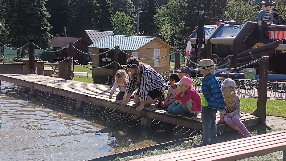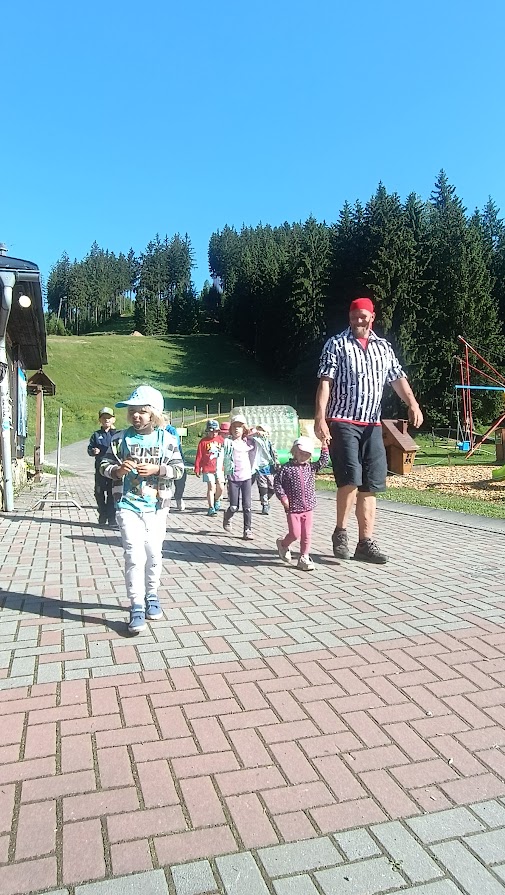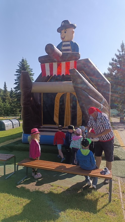 Společně jsme vyrazili na výlet na Bílou, kde nás čekal bohatý program s názvem "Vzhůru na plavbu". Program zahrnoval jízdu v lodičkách, skákání na trampolíně, návštěvu lesního lanáčku, hledání tajemného pokladu, kreslení námořnických vlajek a návštěvu skákací lodě a mnoho dalšího.