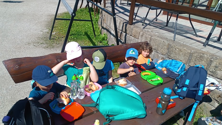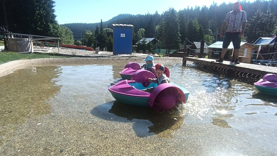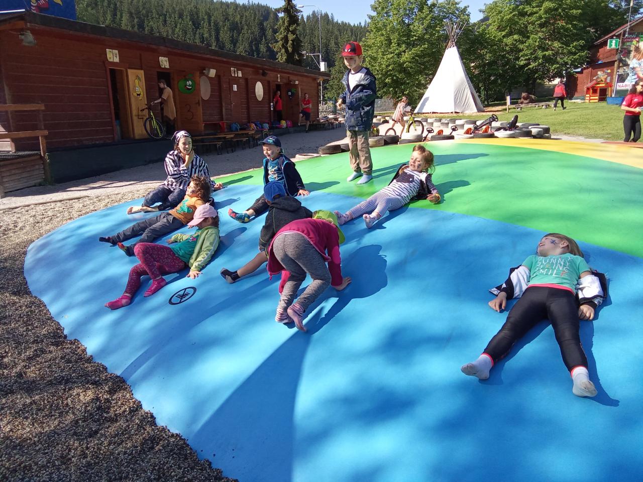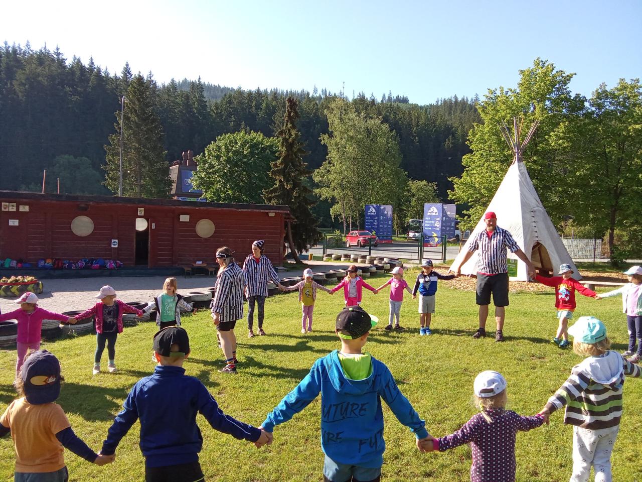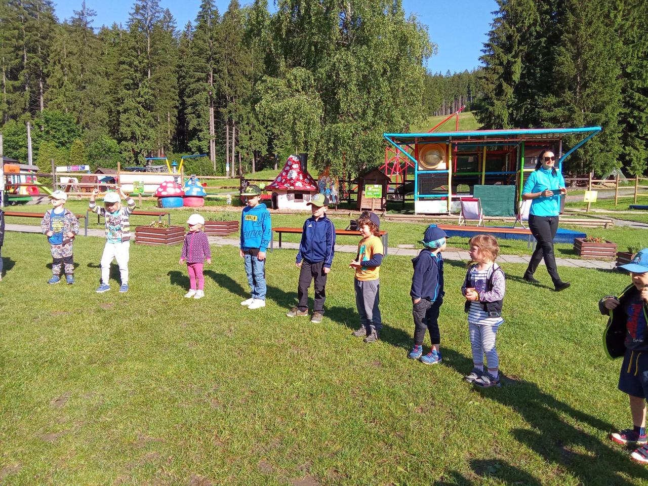 Společně jsme vyrazili na výlet na Bílou, kde nás čekal bohatý program s názvem "Vzhůru na plavbu". Program zahrnoval jízdu v lodičkách, skákání na trampolíně, návštěvu lesního lanáčku, hledání tajemného pokladu, kreslení námořnických vlajek a návštěvu skákací lodě a mnoho dalšího.