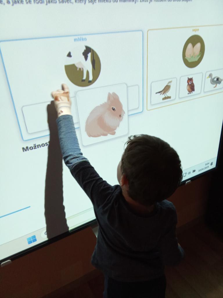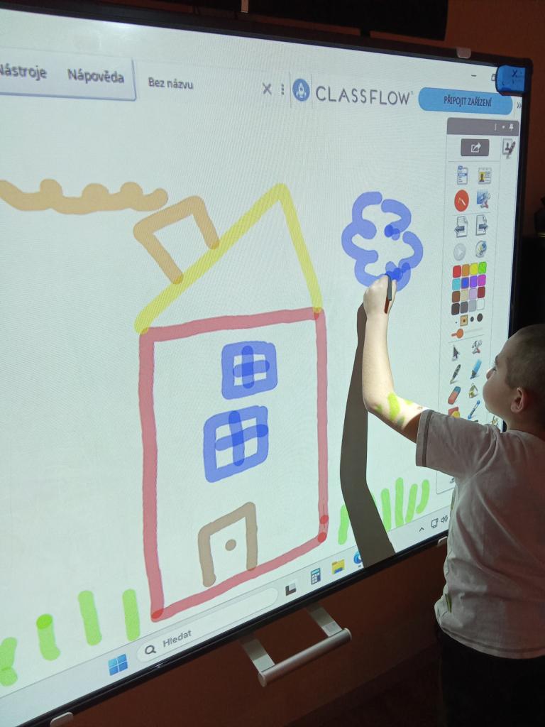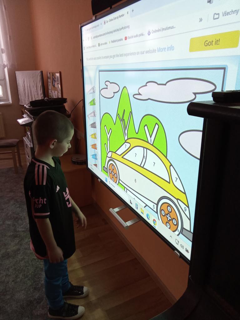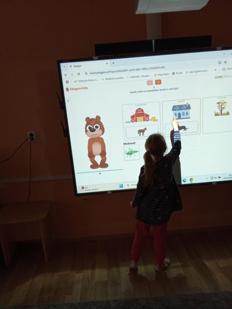 Děti si na interaktivní tabuli nejen prohlubují své znalosti, ale procvičují si také grafomotoriku, kreslení, vybarvování, přetahování objektů, logické uvažování, kódování a jiné.