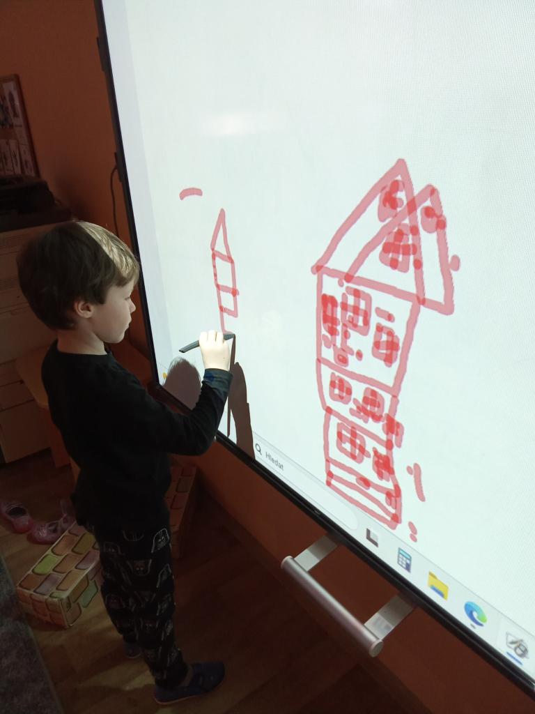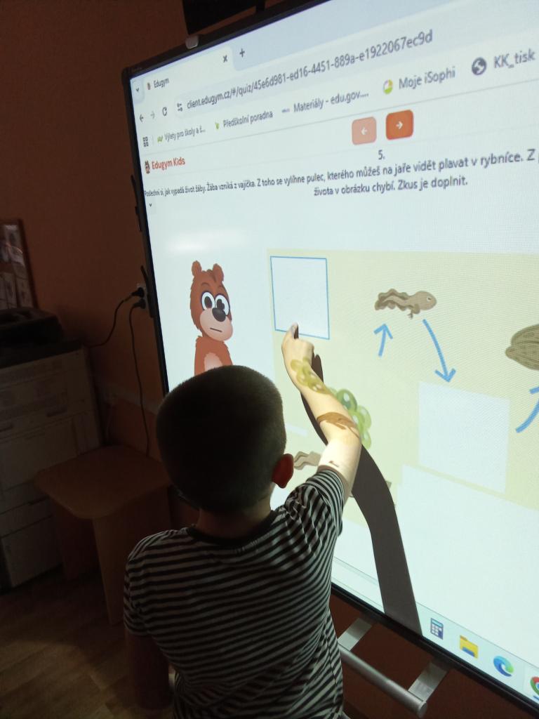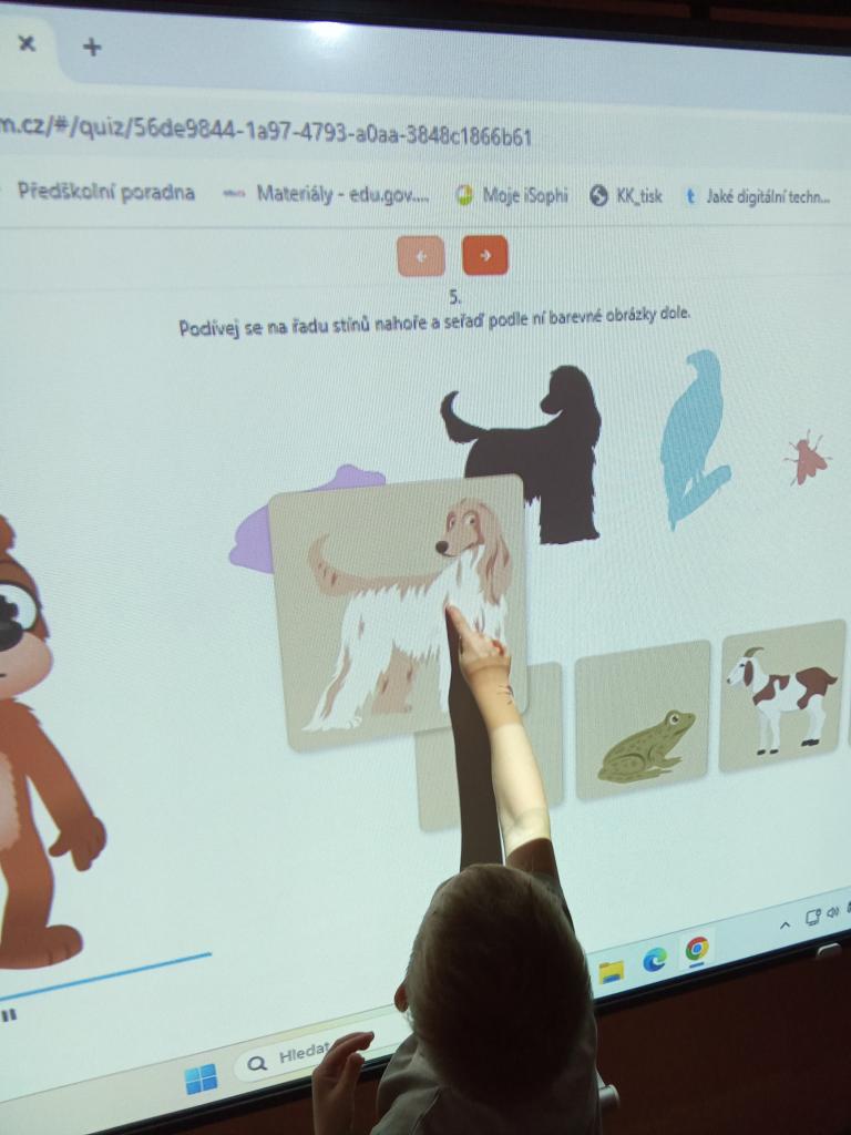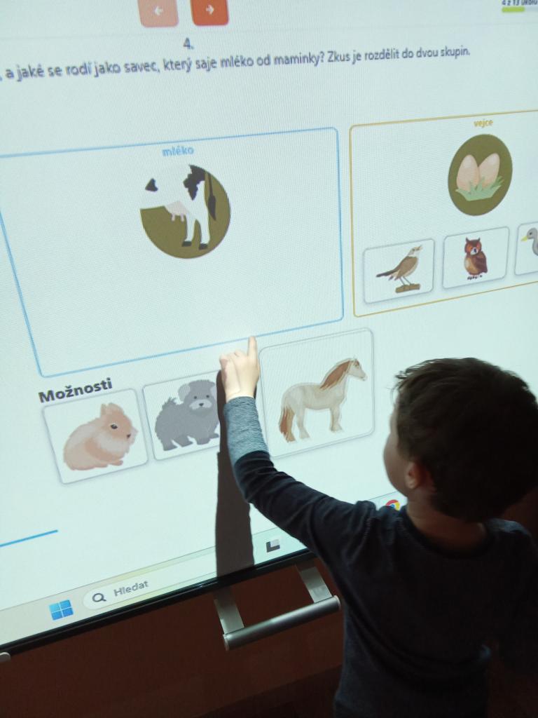 Děti si na interaktivní tabuli nejen prohlubují své znalosti, ale procvičují si také grafomotoriku, kreslení, vybarvování, přetahování objektů, logické uvažování, kódování a jiné.