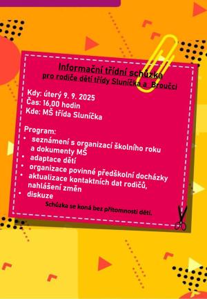 INFORMAČNÍ TŘÍDNÍ SCHŮZKA PRO RODIČE DĚTÍ TŘÍDY SLUNÍČKA A BROUČCI