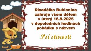 V rámci dopoledního programu děti navštíví divadelní představení „Psí starosti“. Čeká je veselý příběh plný zábavy, dobrodružství a poučení o přátelství a péči o zvířátka. Představení proběhne během dopoledních hodin v prostorách školky.