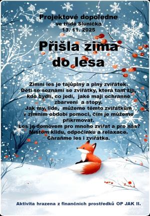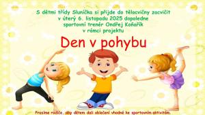 Dne 22. 10. 2025 oslaví třída Sluníčka Den stromů aktivitami zaměřenými na přírodu a význam stromů. Program je hrazen z projektu OP JAK II. Děti čeká zábavné a naučné dopoledne plné her, tvoření a poznávání přírody.