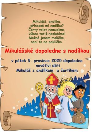 Mikuláš je milý děda, hodné děti všude hledá. Bílé vousy, ty mu sluší, na zádech má velkou nůši. A v té nůši balíčky, pro kluky a holčičky.
