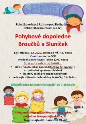 Děti obou tříd navštíví dětskou hernu Pohádkové lázně v Rožnově pod Radhoštěm.