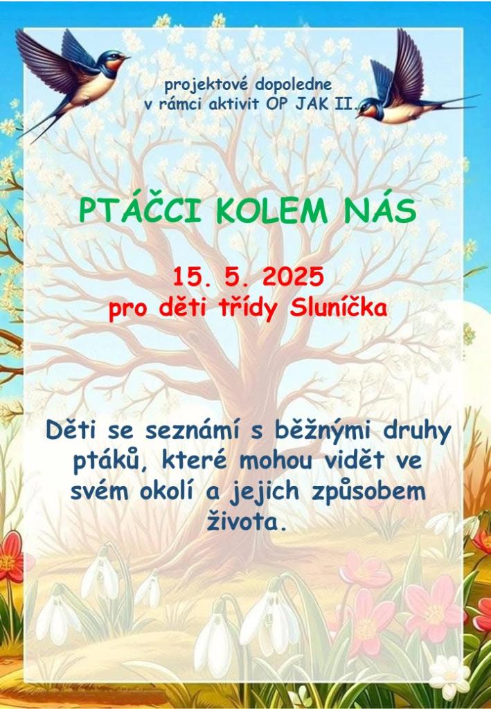 15.5. se děti seznámí s běžnými druhy ptáků, které mohou vidět ve svém okolí a jejich způsobem života.